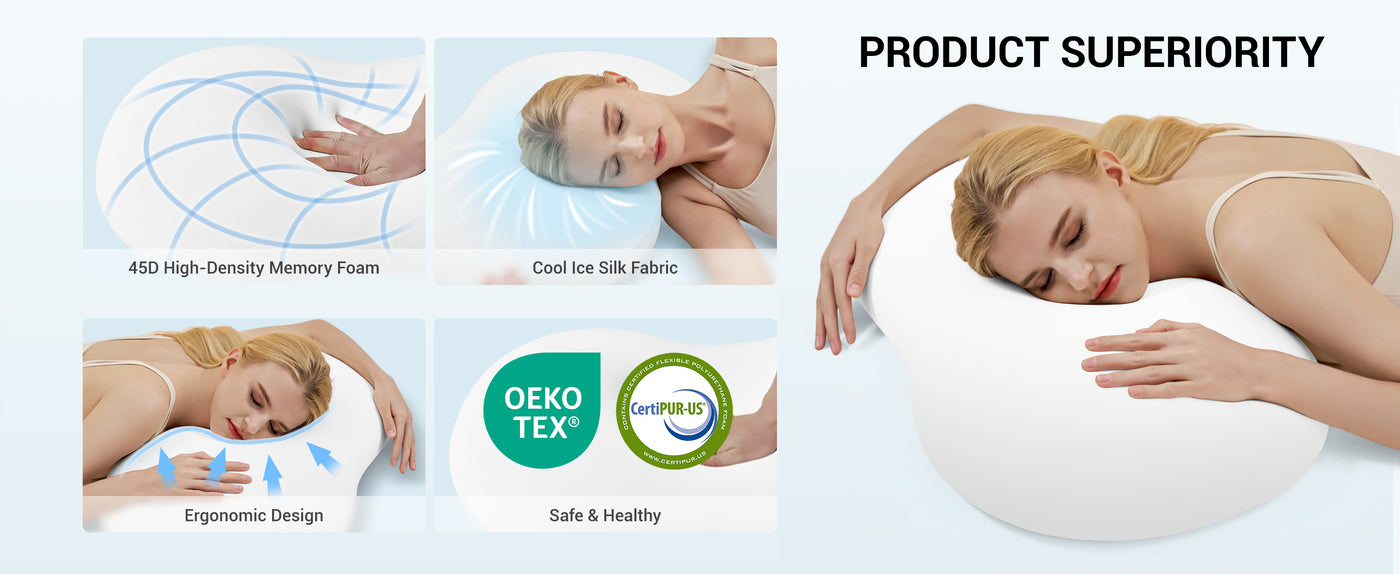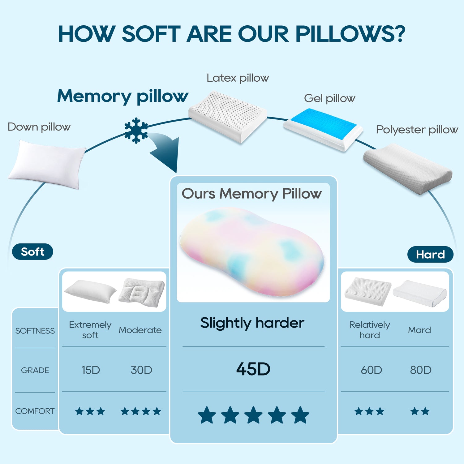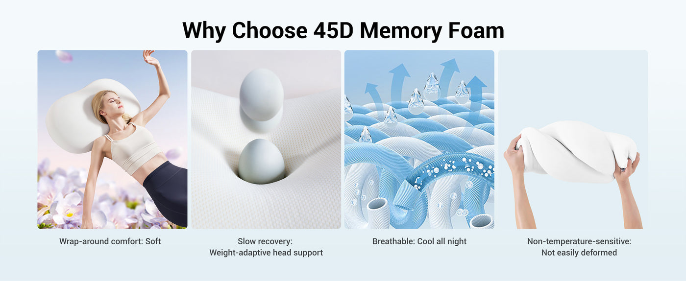 · 45D high-density memory foam: Super soft, it is as soft as cotton and rebounds slowly when you lie down, providing support for the head