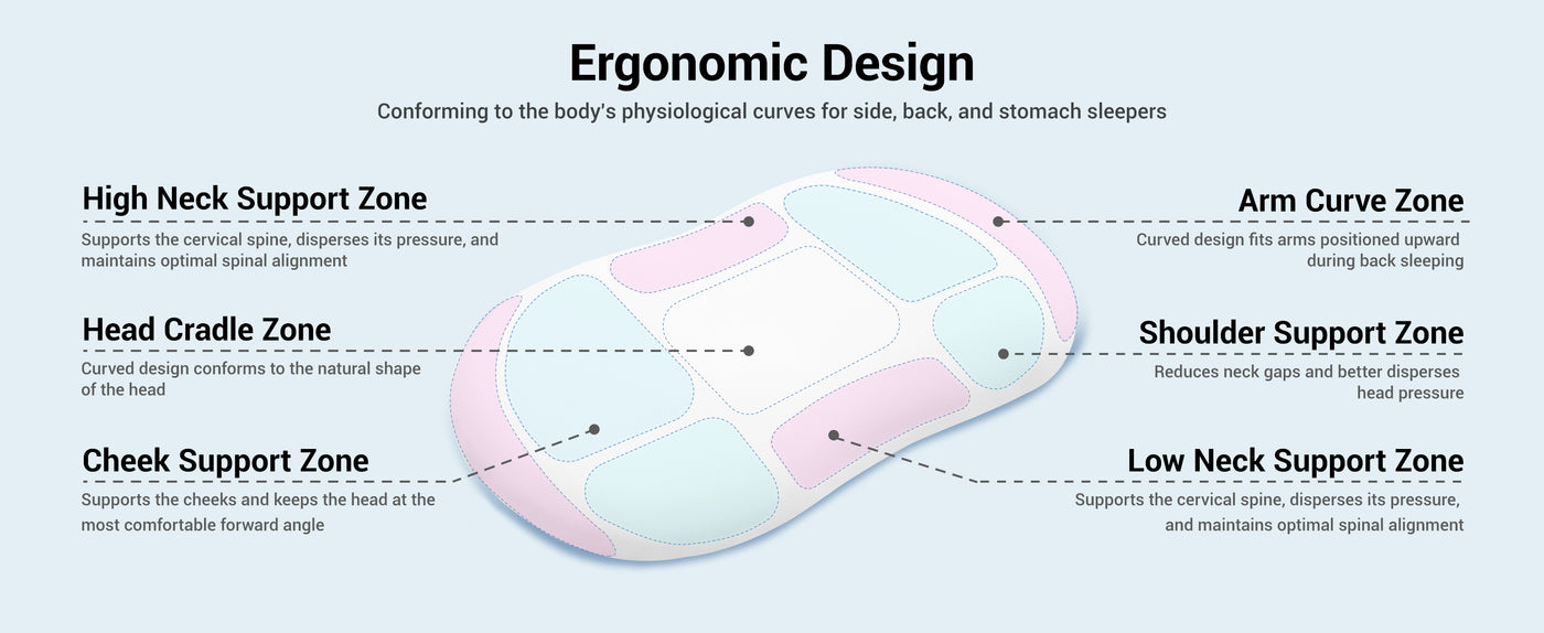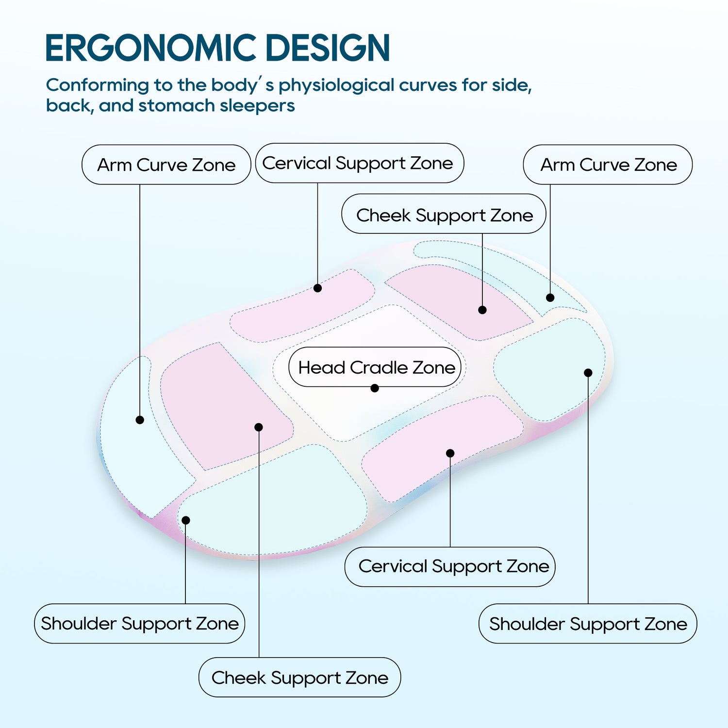 ·Ergonomic contour design: It fits the body curves of various parts of the human body when sleeping on the side, back, or stomach, including the shoulder/cervical spine/cheek support area, brain fossa wrapping area, and hand bending area, memory foam pillow for neck pain relief