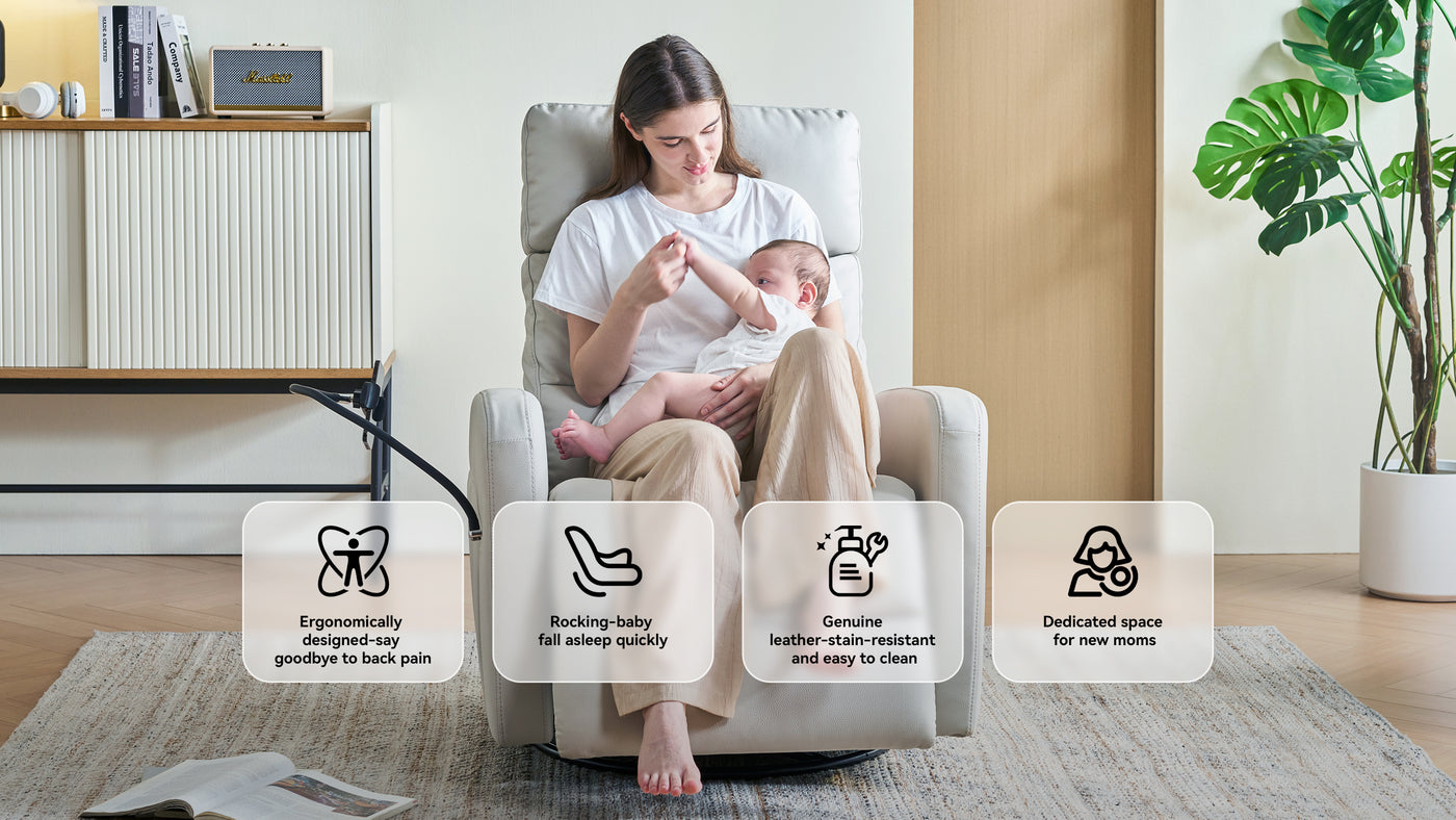 Designed with smooth reclining and rocking functions, it eases fatigue and keeps parent and child relaxed. Supportive cushioning and durable design make it a cozy, practical nursery addition.
